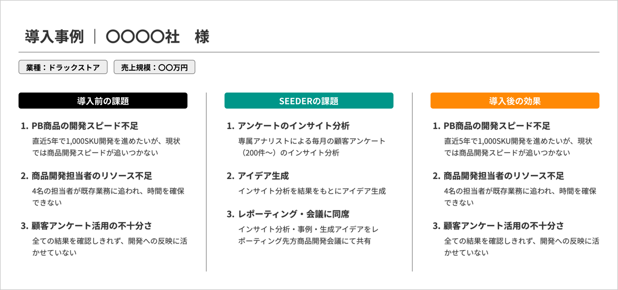 SEEDERでは、自社でストックしているリサーチデータの提供から、新規事業創出や新商品開発のサポート等のコンサルティングまでクライアント様にあわせたサービスをご提供しております。